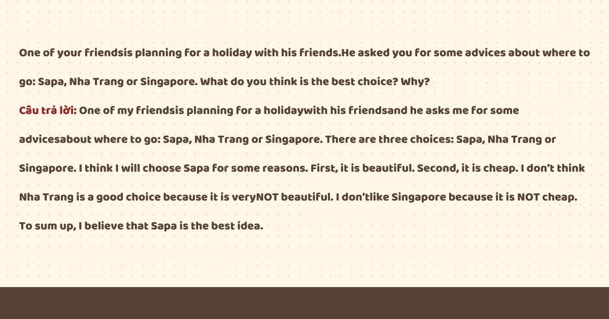 I think I will choose (Lựa chọn A) for some reasons. First of all, it is….. (Lí do 1). Second of all, it is