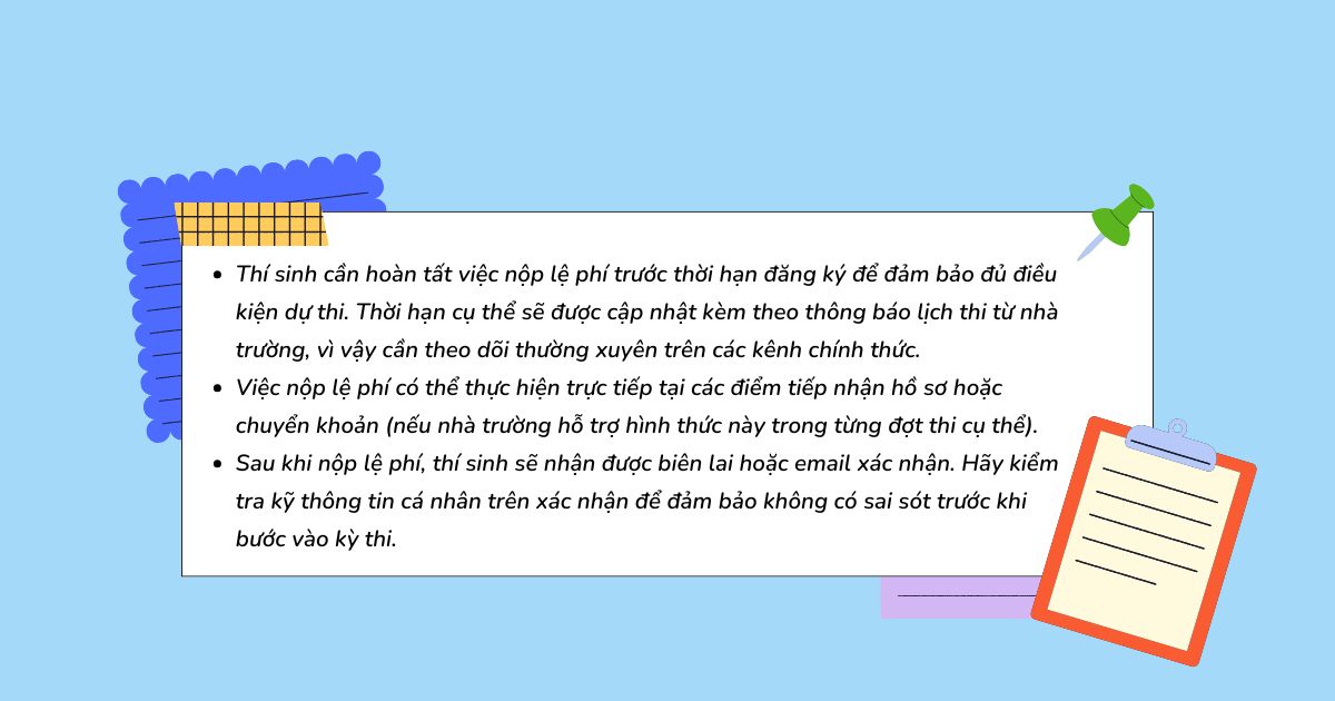 Trong trường hợp gửi hồ sơ qua đường bưu điện, thí sinh cần đính kèm minh chứng đã thanh toán lệ phí dự thi, đảm bảo hồ sơ được gửi đúng thời hạn quy định. Sau khi gửi, vui lòng liên hệ hotline 090 990 1277 để xác nhận.