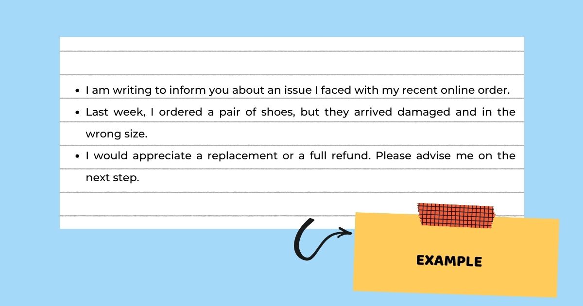 ✅ Đúng: I am writing to complain about the poor service at your restaurant last week. The staff were rude, and my food arrived cold.